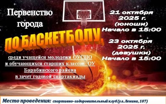 21 и 22 октября в спортивно-оздоровительном клубе ( ул. Ленина 107) состоится первенство города по баскетболу среди учащейся молодёжи ОУ СПО и обучающихся старших классов общеобразовательных учреждений Барабинского района в зачет годовой спартакиады. Начало соревнований в 15.00